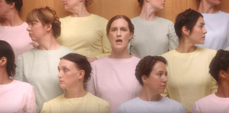 “… at times, though I know better, I’ll catch myself thinking in terms of what I should desire of womanhood instead of what I actually desire. I catch myself feeling I am failing at something, at some ideal I was never actually aiming for. I finished these lyrics a year ago. It’s strange to release the song now, when it feels so much is coming to a head. So much has cracked open for women, in the year since writing ‘Domestication.’ So much remains the same… Though I’d meant ‘domestication’ in the animal sense, when it came time to make the video, I liked the idea of using the term in the homemaking sense. I’d been obsessed with this photo I’d found of the pastel women of the FLDS cult, and wanted to build a world and a story around the aesthetic, something like the speculative societies of Margaret Atwood or Ursula Le Guin. At the end of the story, I wanted the women to act like wolves.”