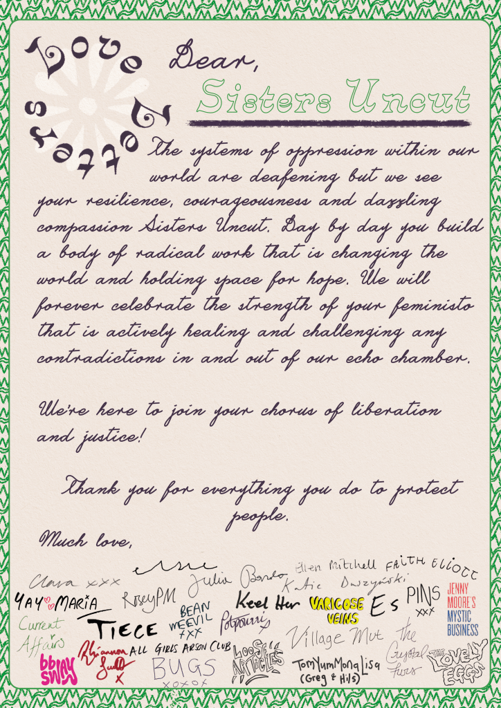Massive thanks to Lauren for talking to us about this vital and beautiful compilation. Buy Love Letters on bandcamp now, and find out more about Sisters Uncut here. And below see the accompanying ‘love letter’ from all the bands involved to Sisters Uncut.