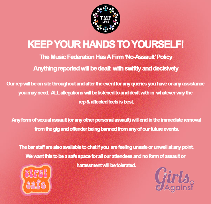 London based music promoters The Music Federation have launched their new Safe Spaces Policy in response to the recent surge in cases of spiking that women across the UK have experienced within the live sector. In partnership with Strut Safe and Girls Against, TMF’s policy has a three-part structure providing guidance for post, during and after show an event, as well as guidance on what to do if attendees feel uncomfortable at a TMF show or if they witness harassment of any kind.